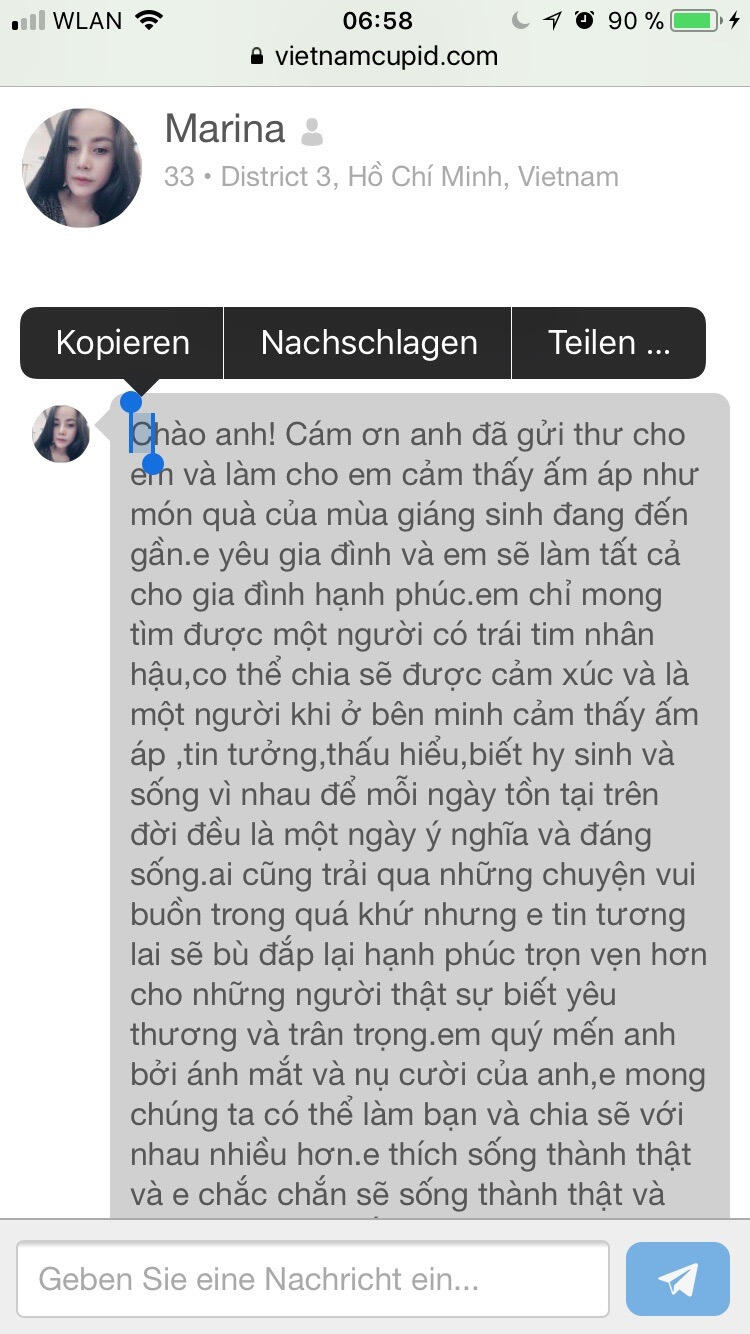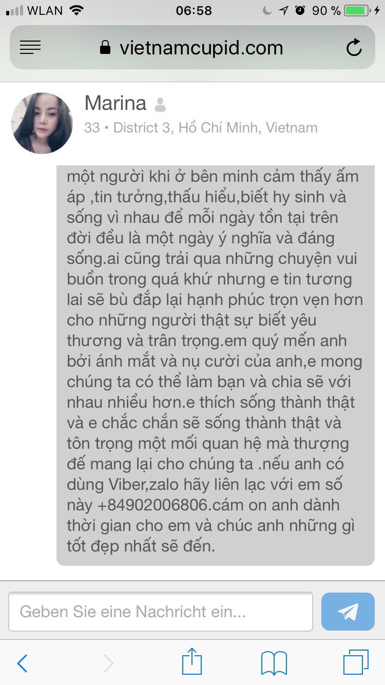 Tin nhắn PNAL gửi cho một nạn nhân từ Đức vào năm 2017 tren Vietnam Cupid.